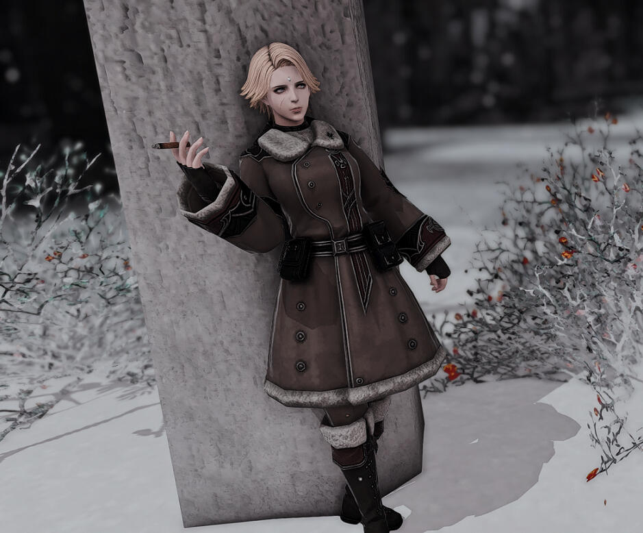 Wild, unsettling pale blue eyes pair with a cold and emotionless gaze that hides the constant turmoil wracking around her mind from all but the most observant and familiar. Though she holds her head high and proud the mask she hides behind can only cover up so much. She carries herself with an air of distrust and over-caution, always on guard, always watching for something lurking in the shadows... Rarely is she seen relaxing and when she is it's often with a cigar of some form.Her clothing is utilitarian and warm, consisting of a thick military coat fit for the climate worn over her old uniform, similar to what many of her fellow survivors also wear. Her pistol and her old medic bag are both kept on her person at all times, and she's always ready to put either of them to use as the situation demands. Glasses are kept in a hard case in her coat -- round, silver rimmed things that she only wears when reading, delicate as they are.Unless one is a fellow Garlean, it's likely their first interaction would involve Livilla sneering at them, for what reason would she have to bother speaking with a savage?